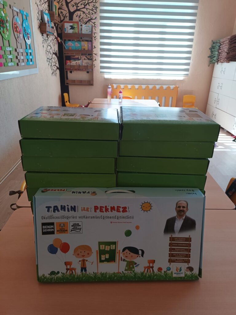 Konya Büyükşehir Belediyesi ve İl Müftülüğü iş birliğiyle Konya’nın 31 ilçesinde bulunan tüm 4-6 yaş Kur’an kurslarında öğrenim gören öğrencilere ve öğreticilere dağıtılan “Tahin ile Pekmez” Okul Öncesi Değerler ve Kavramlar Öğrenci Eğitim Seti, hikayeler, bilmeceler, oyunlar ve tüm gelişim alanlarında destekleyici etkinliklerle dolu yedi adet kitaptan oluşuyor.