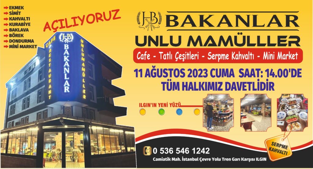 Ilgın Tren Garı karşısında ana yola cephe 4 katlı mağazası ile Cuma günü açılışını gerçekleştirecek olan Bakanlar Unlu Mamüller Cafe konseptinde de hizmet verecek.