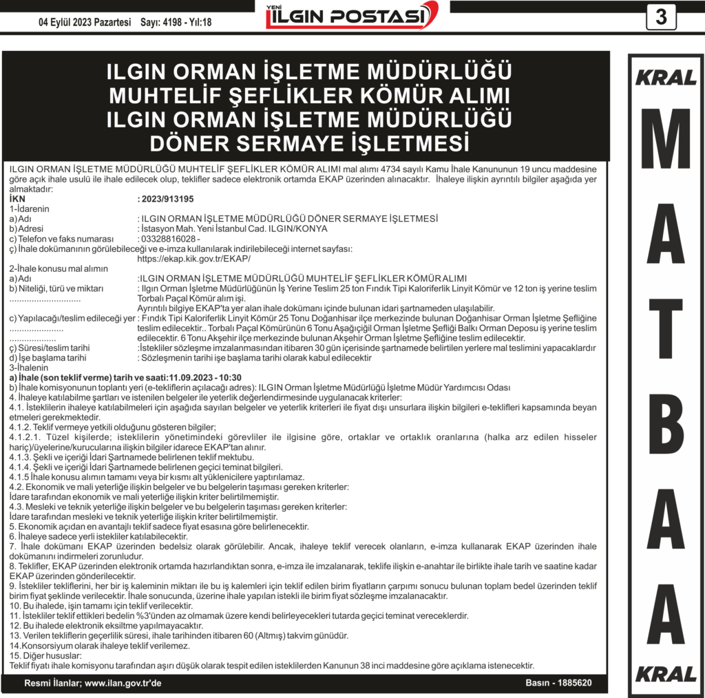 ILGIN ORMAN İŞLETME MÜDÜRLÜĞÜ MUHTELİF ŞEFLİKLER KÖMÜR ALIMI ILGIN ORMAN İŞLETME MÜDÜRLÜĞÜ DÖNER SERMAYE İŞLETMESİ